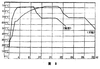 圖2為貼硅板和不貼硅板的爐溫曲線。 每燒一爐鑄鋼件可縮短十小時,每爐可節約煤氣6000m3(合標煤l250kg)。每立方米煤氣價0.025元,共計150元。每月生產按25爐計算,共可節 約煤氣十五萬立方米(合標煤31250kg)。一臺爐每月 可為國家節約煤氣費3750元。