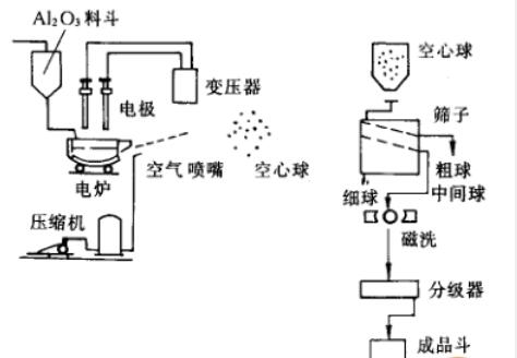 氧化鋁空心球的制備方法有滾球燒失法和熔融噴吹法。滾球法是先用有機樹脂或低熔物做成芯丸,放在旋轉的圓盤里,再把含有一定水分的潮濕的氧化鋁細粉撒在盤中,粘附在芯丸上,形成一個外殼,宛如在藥丸外包裹一層糖衣一樣。然后把這種球丸放在高溫下燒成,其中的芯丸燒失揮發掉,而外殼達到燒結,形成空心球。這種方法的缺點是效率低,球面不光滑,且壁厚及大小不易控制,因此工業生產中采用得不多。